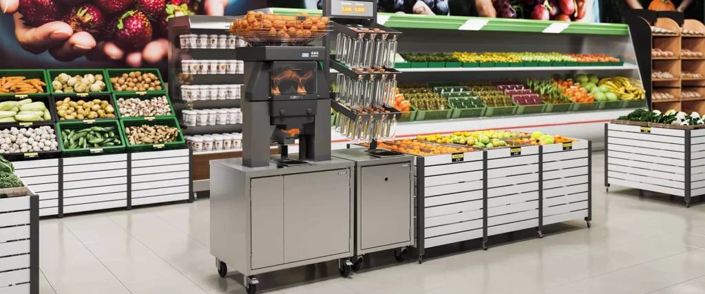 Este concepto de prensa de cítricos cubre las necesidades específicas de los supermercados y grandes superficies. Su alta velocidad de exprimido y su amplia gama de diámetros compatibles hacen de este modelo la elección adecuada para el exprimido óptimo de naranjas de cualquier tamaño.